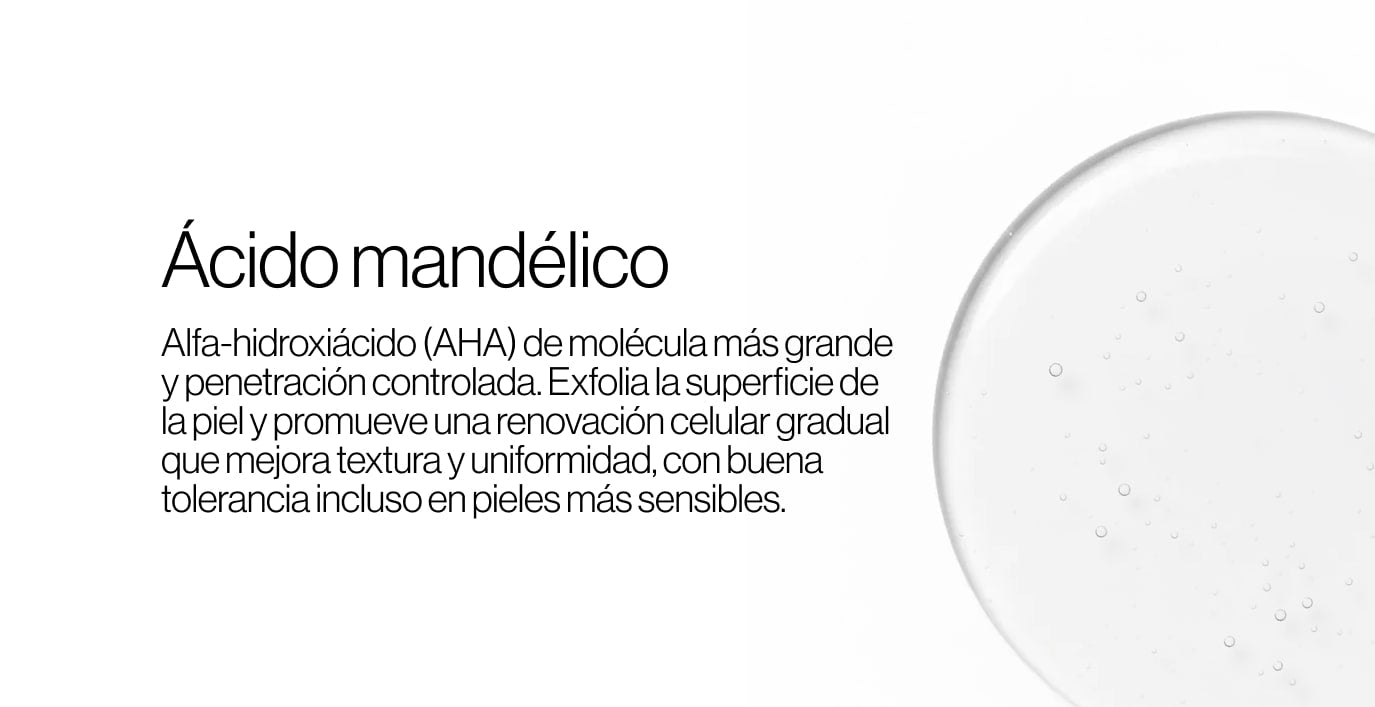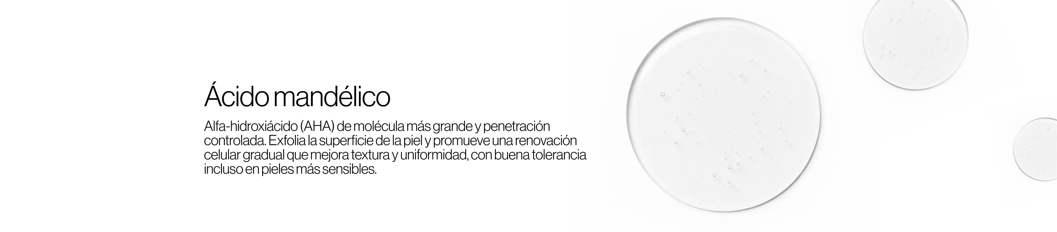 Contiene ácido mandélico al 8 %, acompañado por un combo sinérgico de ingredientes activos que complementan su acción:
