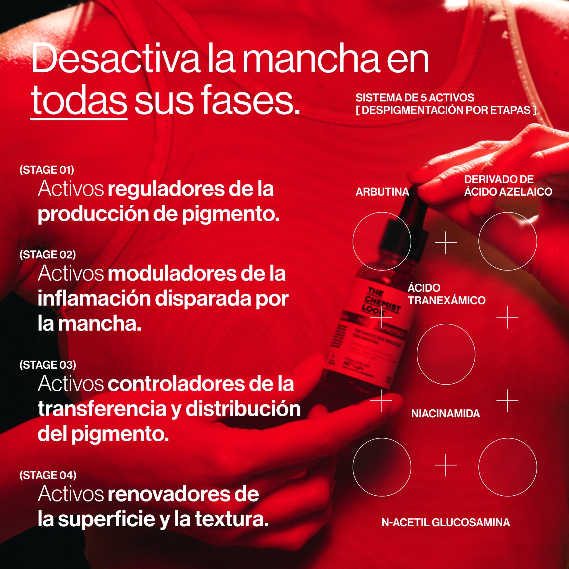 Un abordaje de precisión en 5 fases que no solo trata la mancha visible, sino que desactiva los procesos que la originan y la mantienen.